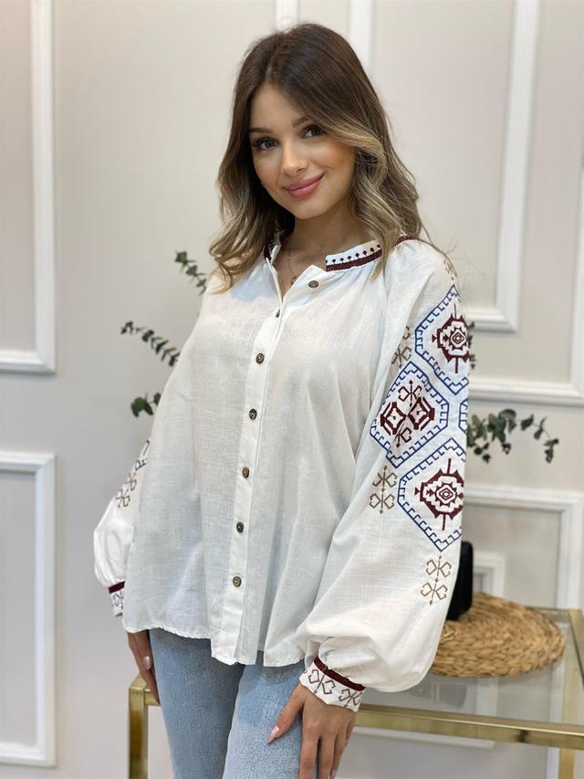 У моделі низ прямий, а кругла горловина доповнена вишитою окантовкою. Довгі рукави-реглани внизу зібрані на манжети з ґудзиком. Основна частина об'ємних рукавчиків декорована гарним візерунком із машинної вишивки гладдю. Застібається вишиванка спереду на ряд гудзиків "під дерево".