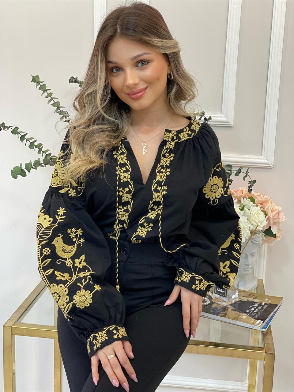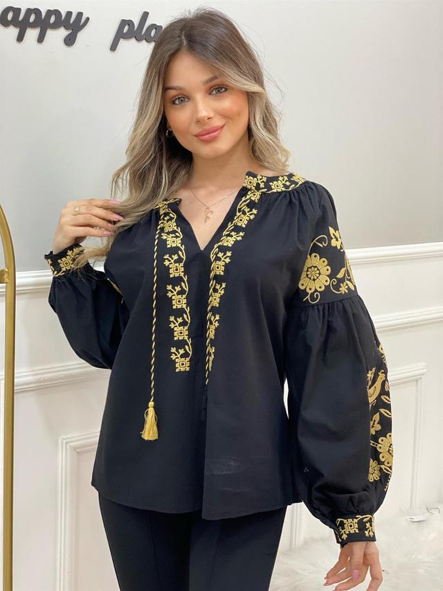 У моделі низ прямий. Горловина V-подібна з гарними зав'язками, які закінчуються китицями. Довгі рукави-реглани знизу мають манжет з ґудзичком. Вишитими рослинними візерунками прикрашені рукави, планка та комір-стійка.