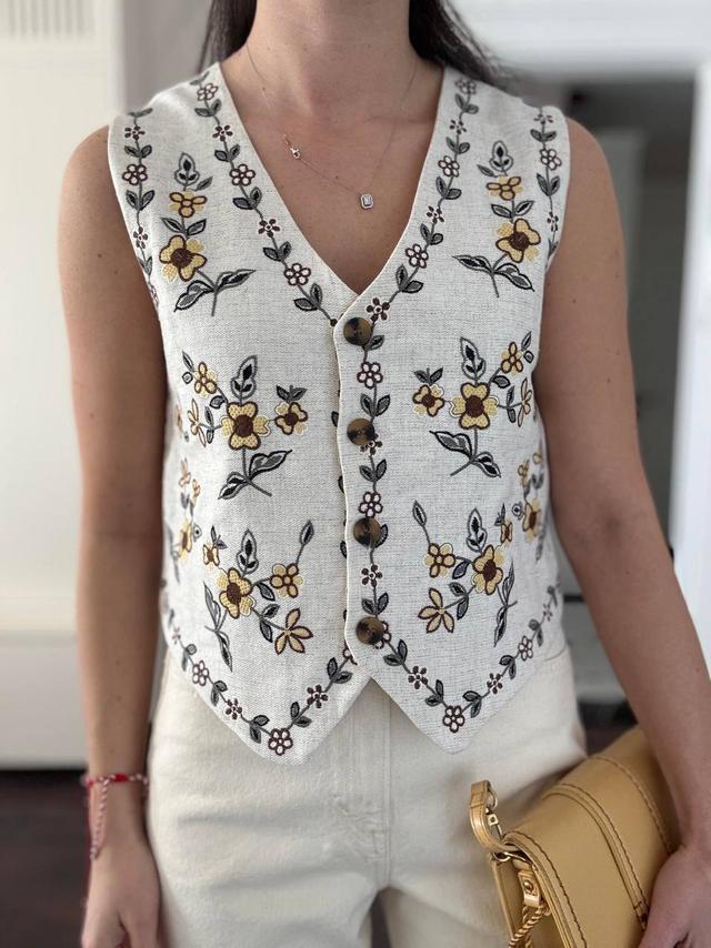 Жіночий жилет з вишитими візерунками стане ідеальним доповненням гардеробу. Модель прямого крою із застібкою на ґудзики приваблює своїм оригінальним дизайном.