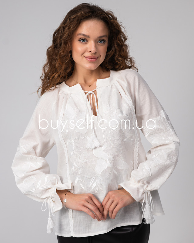 У моделі передня частина багато прикрашена вишитими візерунками з машинної вишивки гладдю та мереживом. Кругла горловина обшита коміром стійкою та спереду регулюється зав'язками. Довгі рукави-реглани оздоблені квітковою вишивкою, внизу регулюються зав'язками.