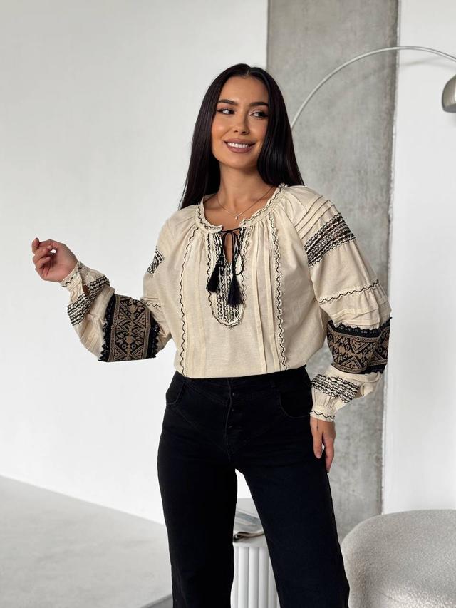 - Колір: світло-бежевий із чорною вишивкою