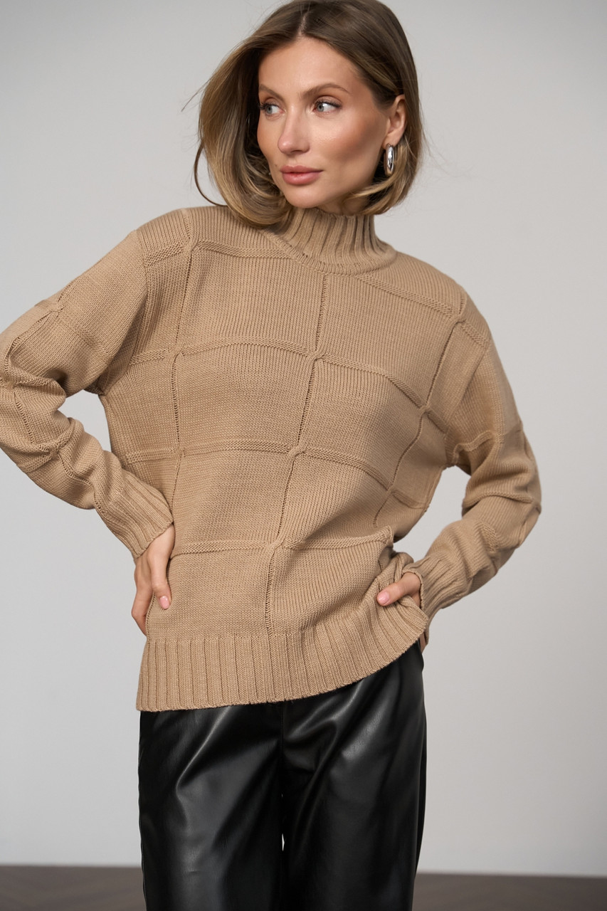 Елегантний светр із преміальної пряжі з додаванням вовни — це поєднання комфорту, якості та сучасного стилю. Рельєфне плетіння створює вишукану текстуру, а пластичне та стабільне переплетіння чудово тримає форму навіть після прання. М’який на дотик, приємний до тіла та ідеально підходить для прохолодних днів.